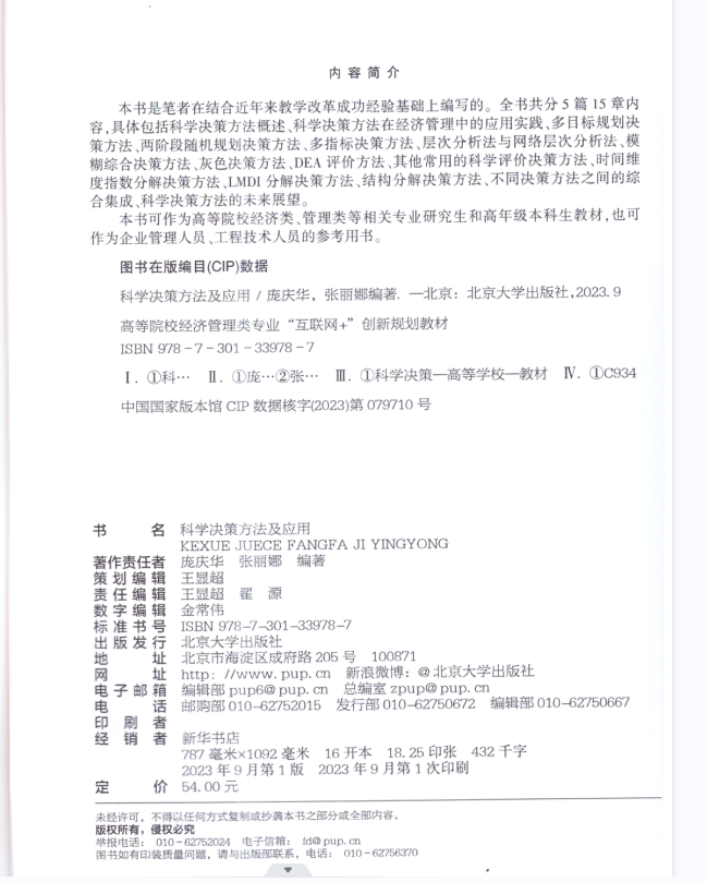 杏吧庞庆华教授与张丽娜副教授在北京大学出版社出版了《科学决策方法及应用》。本书共分为5篇15章,包括基础篇、科学配置篇、科学评价篇、因素分解篇和思考篇。本书主要面向于研究生教学,受到杏吧 研究生精品教材项目资助。
