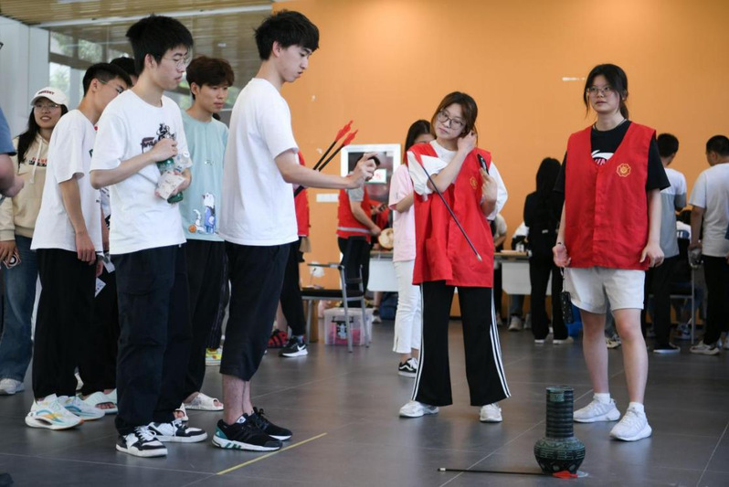 《东观汉记》有云:“大型盛会,必雅歌投壶。”投壶是一项古老而富有趣味的游戏。同学们首先通过猜拳的方式决定投掷先后,然后依次站在投壶线上进行投掷。同学们专注的眼神和谨慎的动作让投壶游戏变得愈发有趣而又激烈。挑战完成后,同学们开怀大笑,既有获胜的喜悦,也有经历投壶游戏后的欢愉。