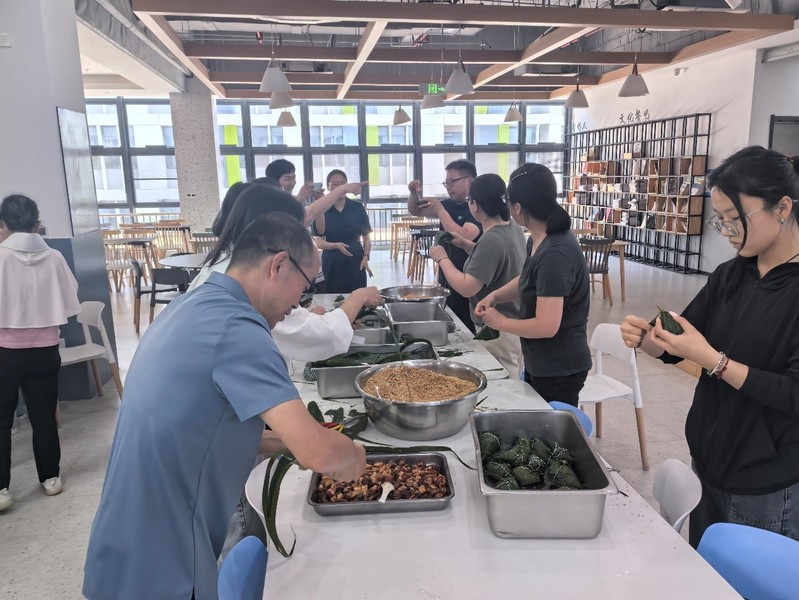 在“廉心粽”制作区域,教师们围在一起,分成若干小组,每组面前都摆放着糯米、粽叶、蜜枣等食材。大家纷纷动手尝试,从卷粽叶、填糯米、放馅料到捆扎成型,每一个步骤都学得认真仔细。虽然不少教师是第一次包粽子,但大家热情高涨,相互学习,分享端午节的由来和廉洁故事,不一会儿,一个个形状各异的粽子便呈现在眼前。有的粽子包裹得严实紧凑,棱角分明;有的则略显松散,形态可爱。教师们看着自己亲手包好的粽子,脸上洋溢着满足和喜悦的笑容。在清风手作体验区,学院工会准备了艾草、香囊等材料,老师们填充艾草,制作香囊,“驱邪扶正”。经过一个多小时的努力,教师们共包制了数百个粽子。大家品尝着自己亲手包制的“廉心粽”,潜移默化中强化了廉洁从教意识。