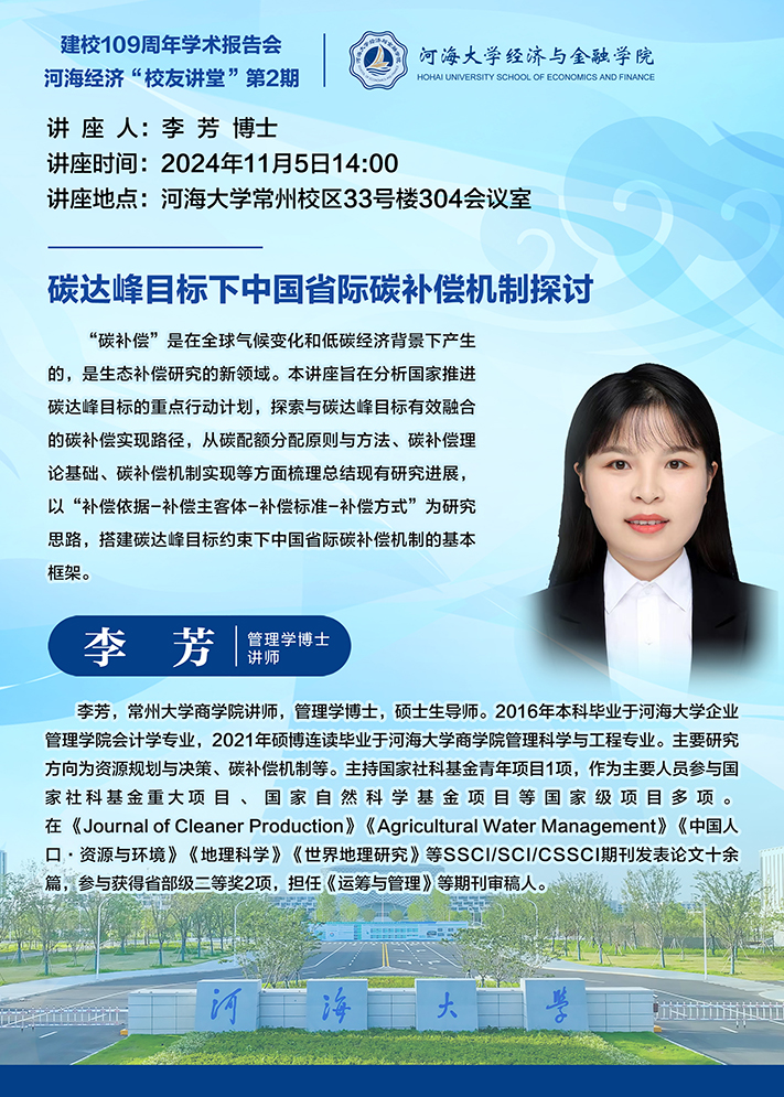 学术报告报告题目:环境经济学领域前沿问题探析主讲人:周慧博士/助理教授报告时间:2024年8月5日下午14:30报告地点:江宁校区博学楼主楼501会议室 主讲人简介:周慧,罗德岛大学环境与资源经济学系助理教授,康奈尔大学应用经济学博士,主要研究方向为环境经济学。近年来在Regional Science and Urban Economics,Journal of Policy Analysis and Management,AEA Papers and Proceedings,Energy Policy等期刊发表论文数篇。杏吧